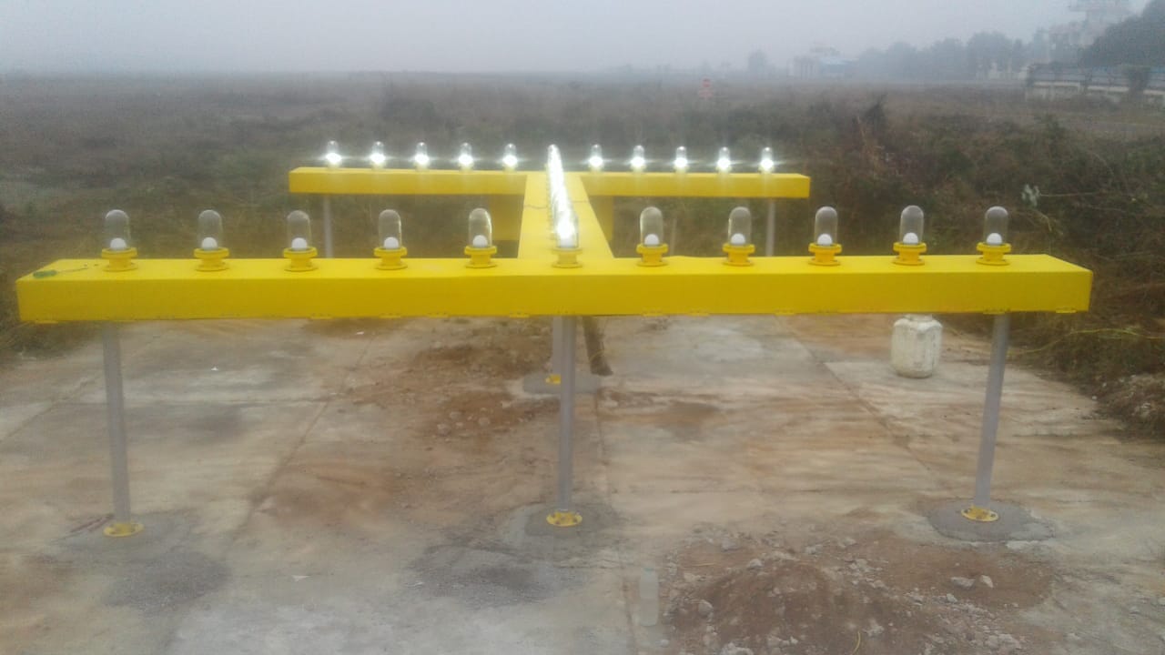 Landing 'H' direction indicator complying ICAO standard consisting of three rectangular AL limbs having length of 4000 mm each supported with 50mm dia Aluminum frangible pipe of 1350mm length & flanges, suitable wattage linear LED lights with driver (minimum IP65) for each limb, each circuits to operate on 230 V, 50 Hz AC supply, providing control unit with suitable control transformer, Relay, Contactor, copper wiring upto Junction Box etc. as required for remote operation of landing 'T' from CCR hall as well as from control tower, connections/ interconnections, MS anchor base plate, neat finish top, painting/ powder coating, all required materials & SS hardware etc. as per client requirement.